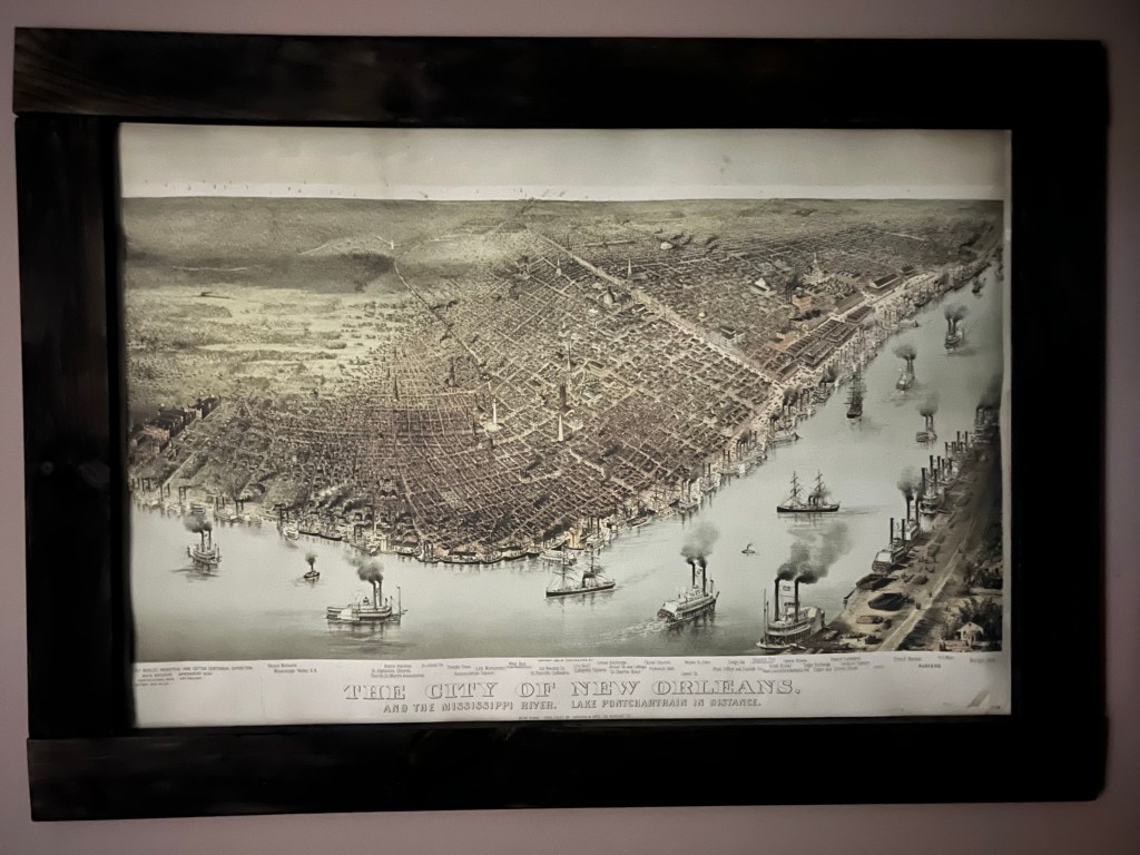 Back a number of years ago I was trying to find something to put on my office wall and ran across someone who made a frame for an old map. That game me the idea and I found this old map of New Orleans and had it printed. Then I made this rough frame to hang it in.