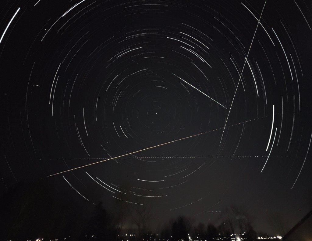 This is a long look at the night sky from our back deck last night. In the middle is Polaris, the North Star, and the other stars rotating around. This is about 90 minutes movement.